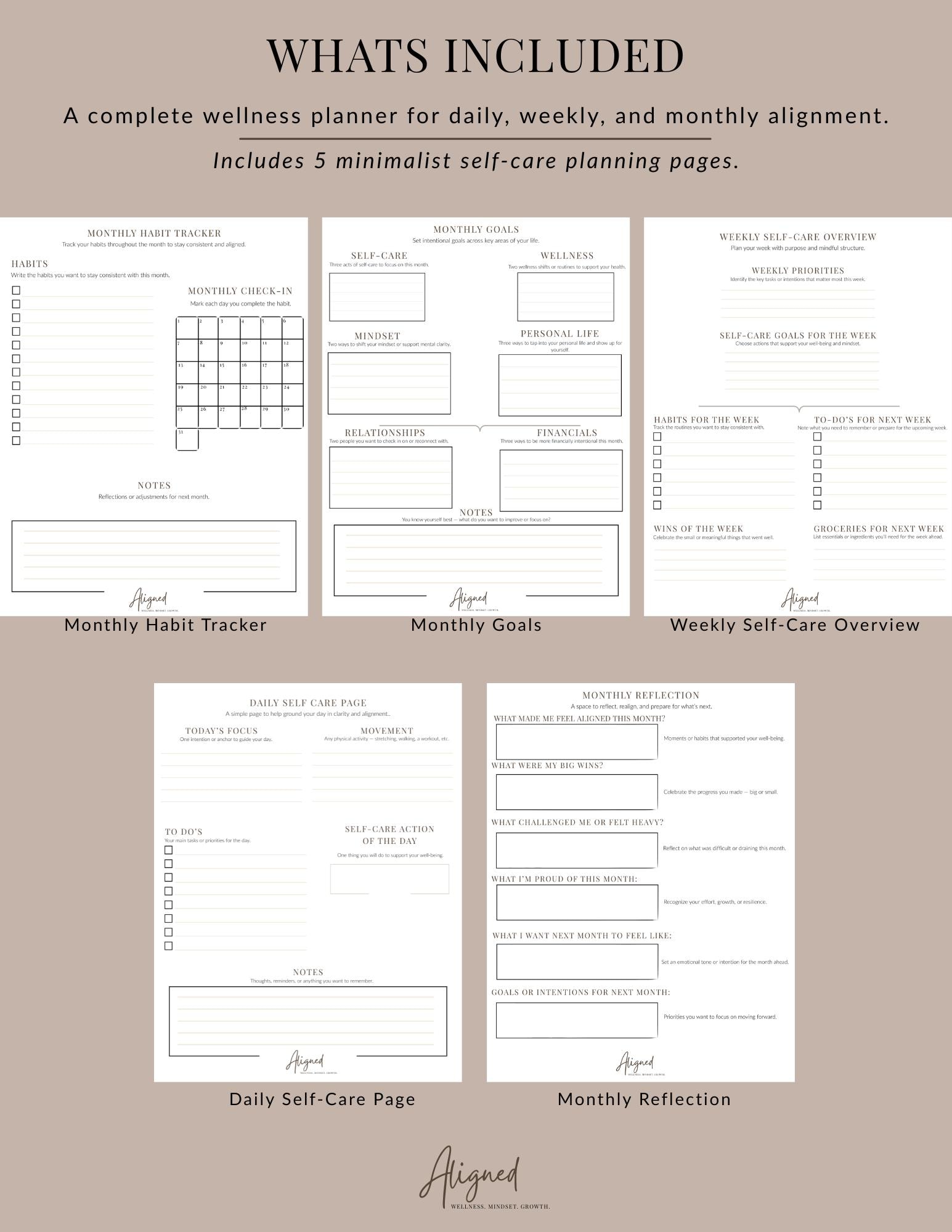 Create a calmer, more intentional life with the Aligned Wellness Planner — a minimal, guided self-care planner designed to help you stay grounded, organized, and aligned with your goals.
