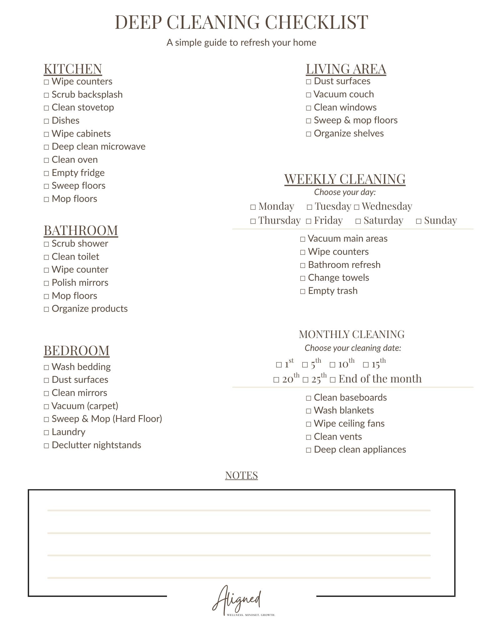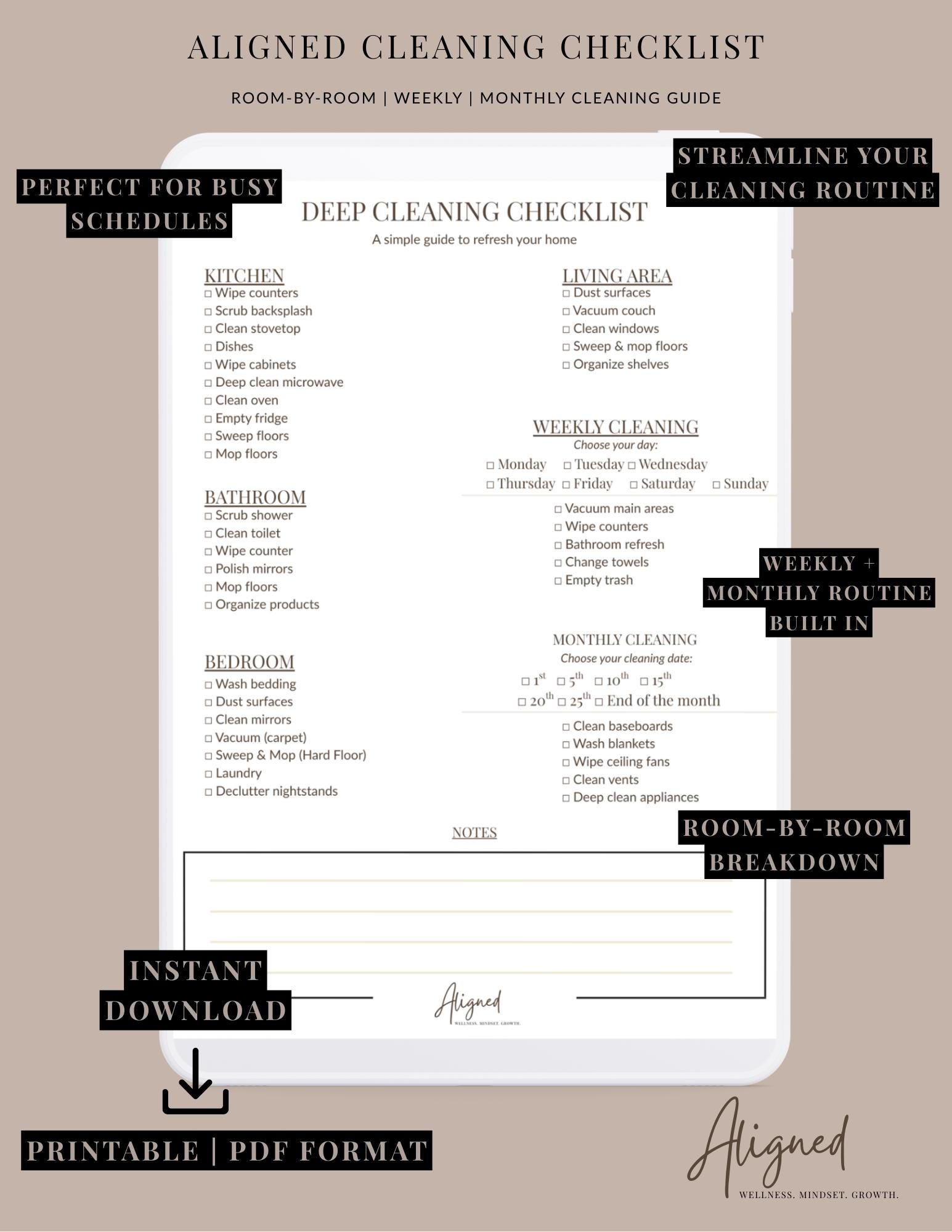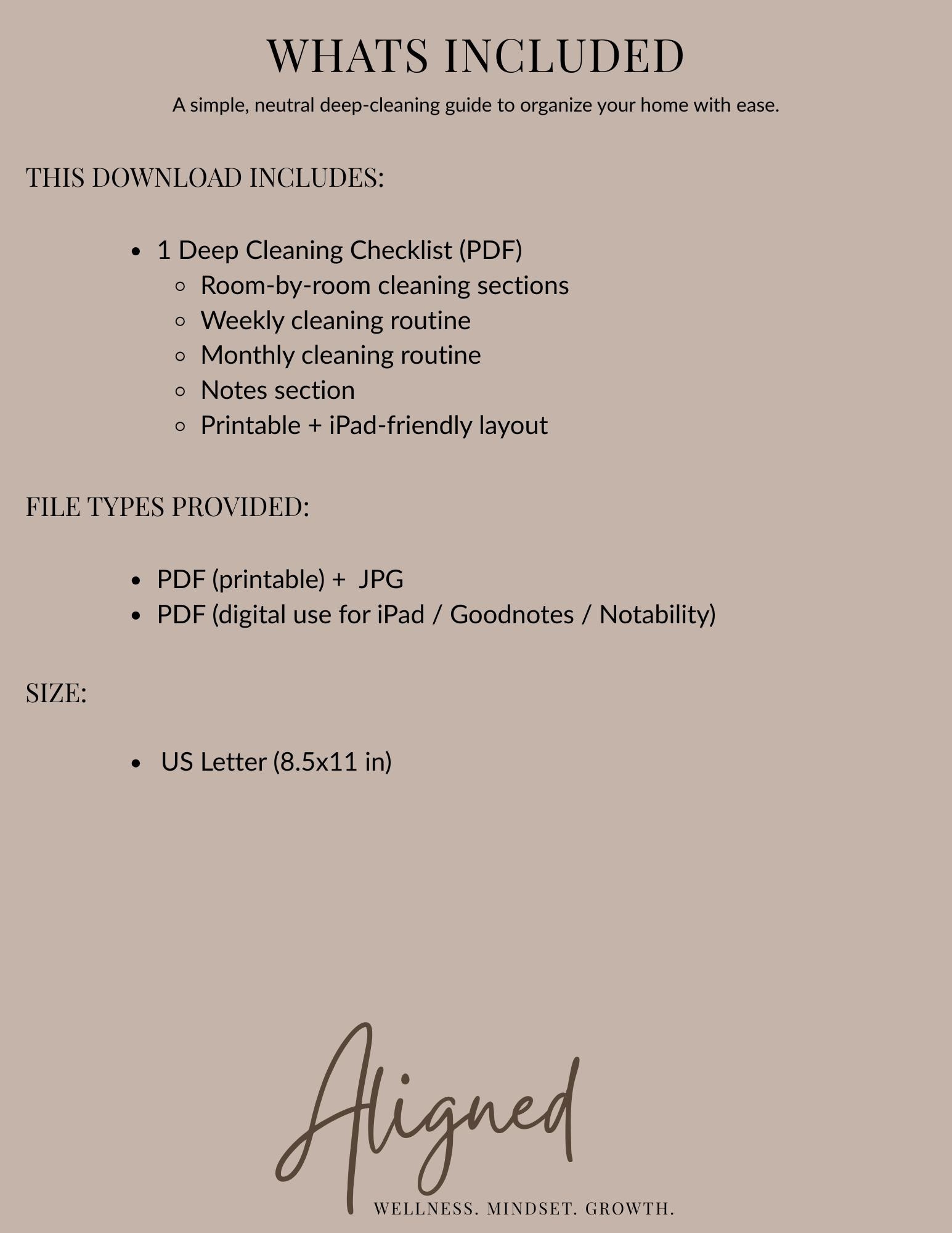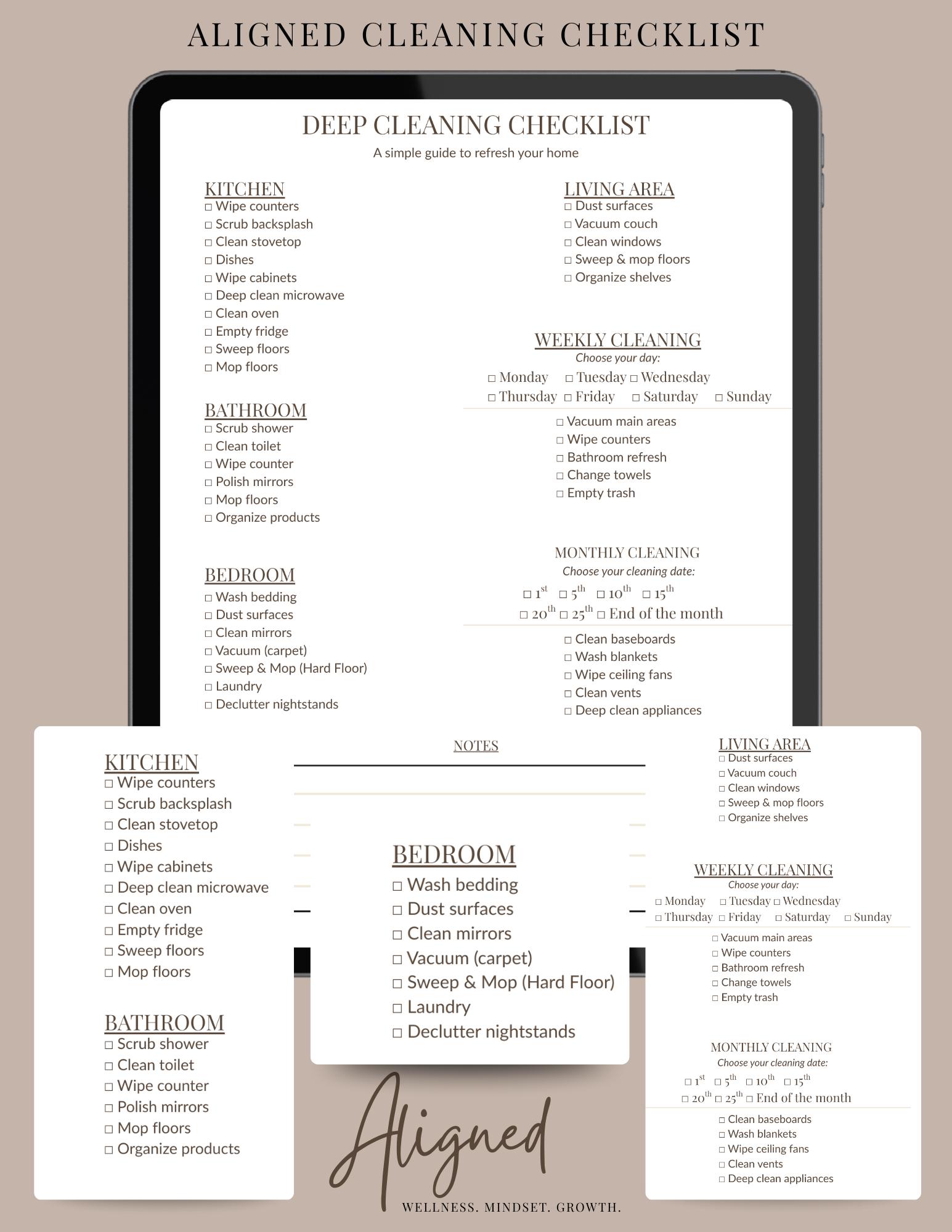 Transform your home with the Aligned Deep Cleaning Checklist — a simple, neutral, and easy-to-follow guide designed to make your weekly and monthly cleaning routines feel lighter and more organized.
