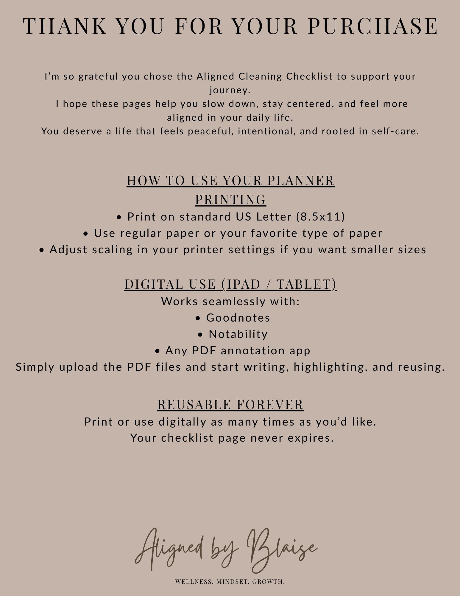 This checklist was designed to help you create a cleaner, calmer home without feeling overwhelmed. One page, simple structure, neutral aesthetic — everything you need for an aligned home routine.