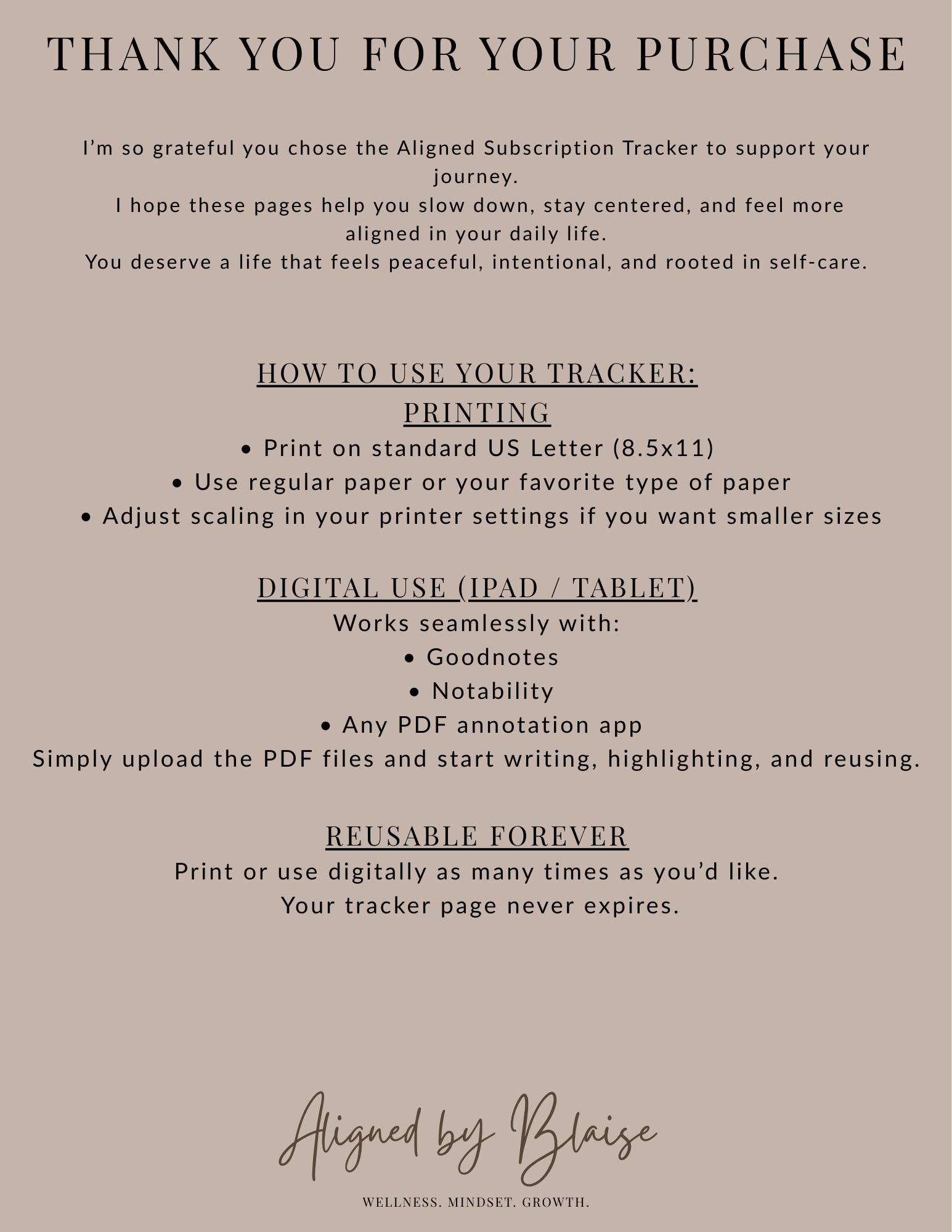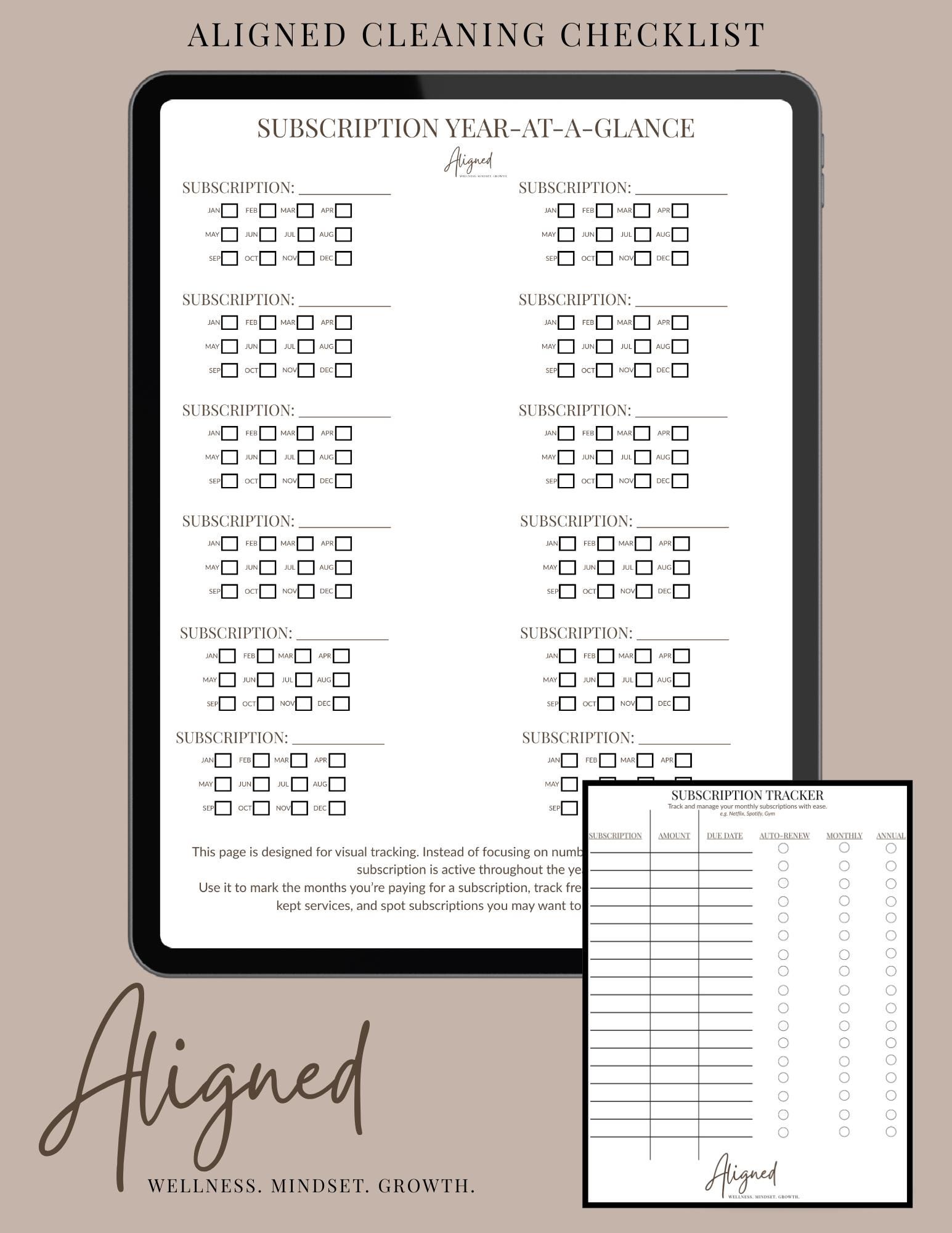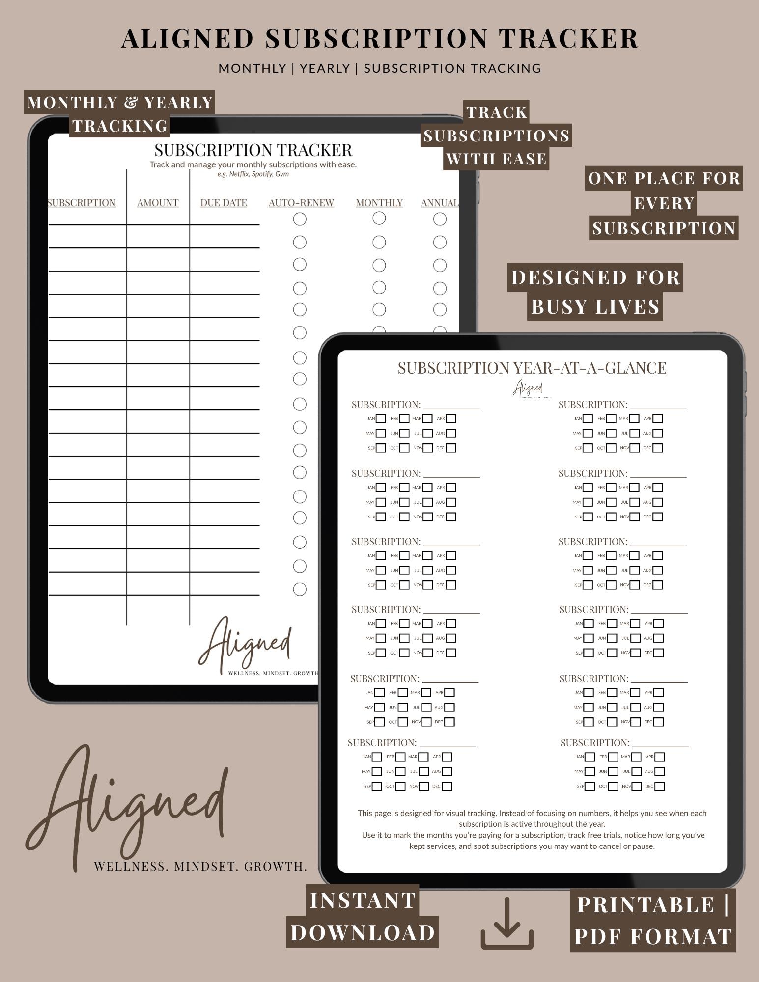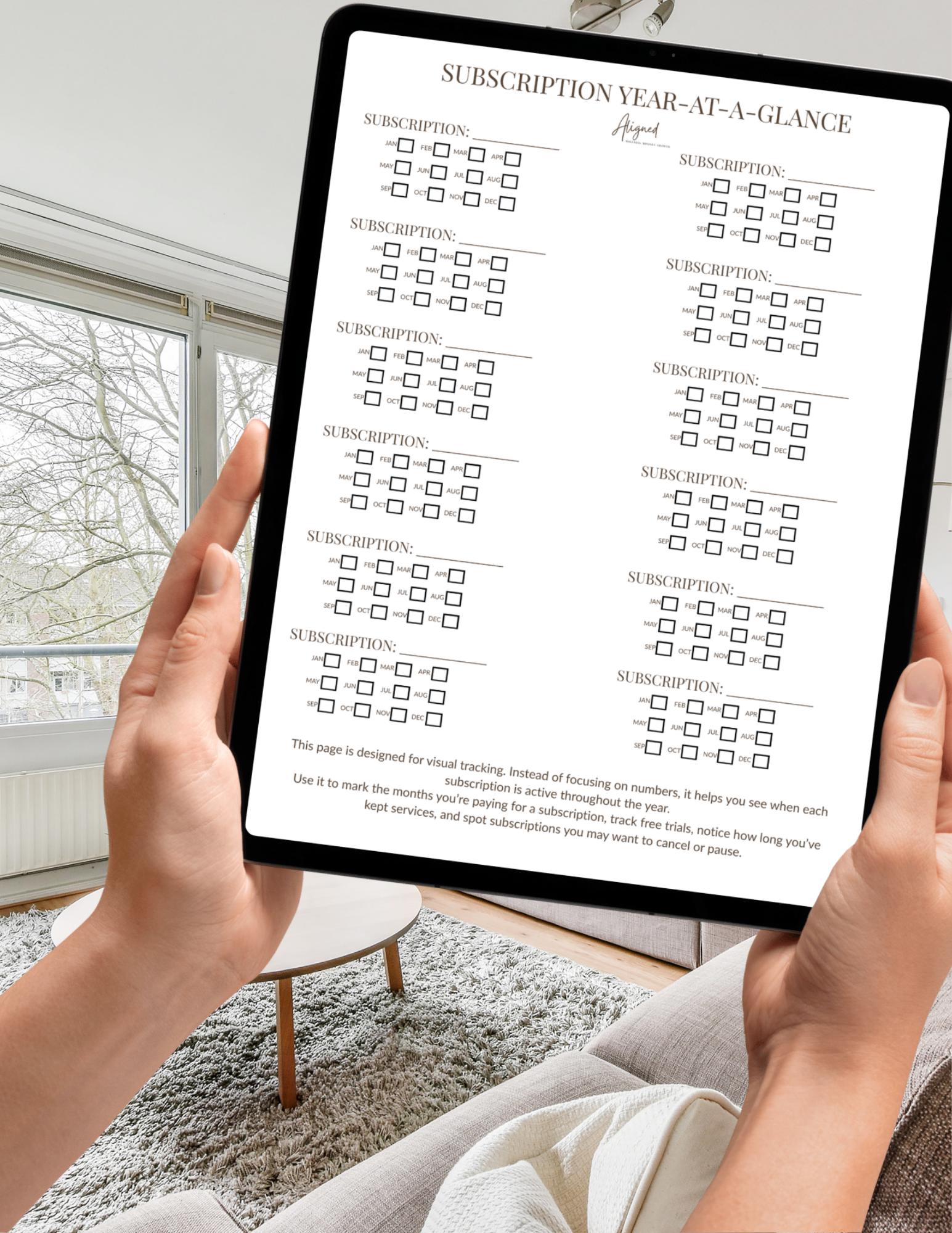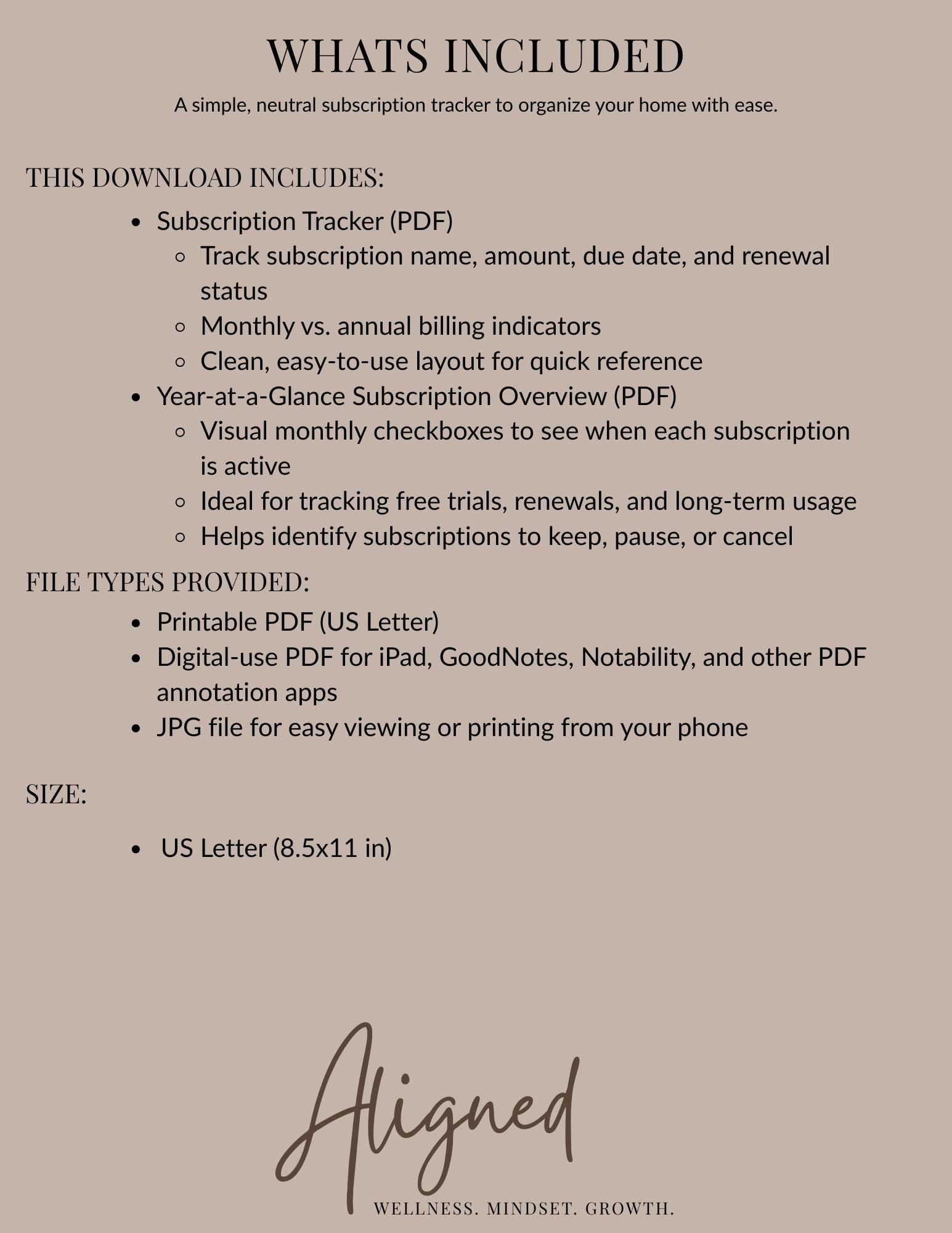 The Aligned Subscription Tracker is a simple, intentional system designed to help you stay aware of your recurring subscriptions without feeling overwhelmed.